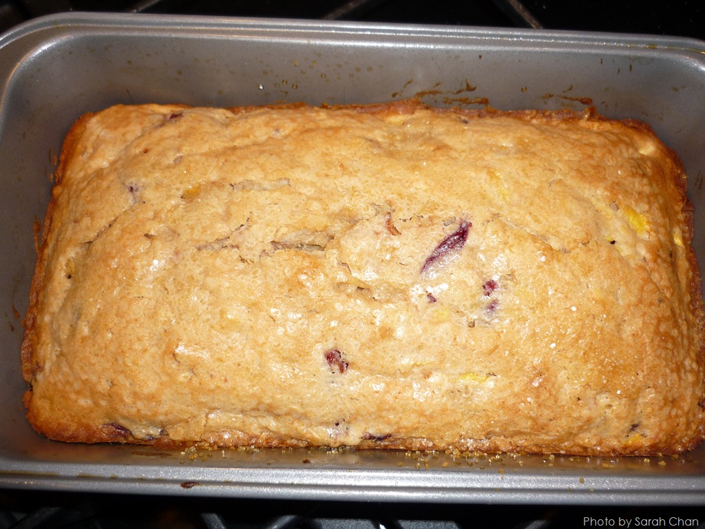 If you’re a fan of peaches, you will absolutely love this pound cake! It’s super moist, just like a pound cake should be. The peaches and cherries make the pound cake that much better, incorporating a natural sweetness to each slice.