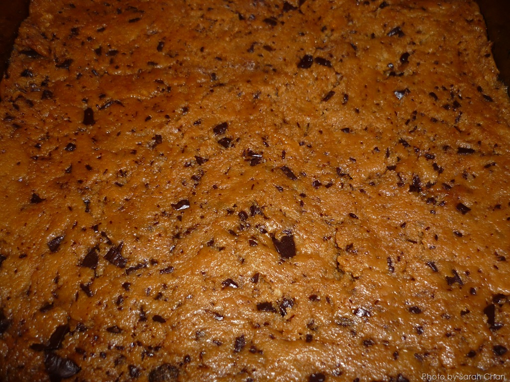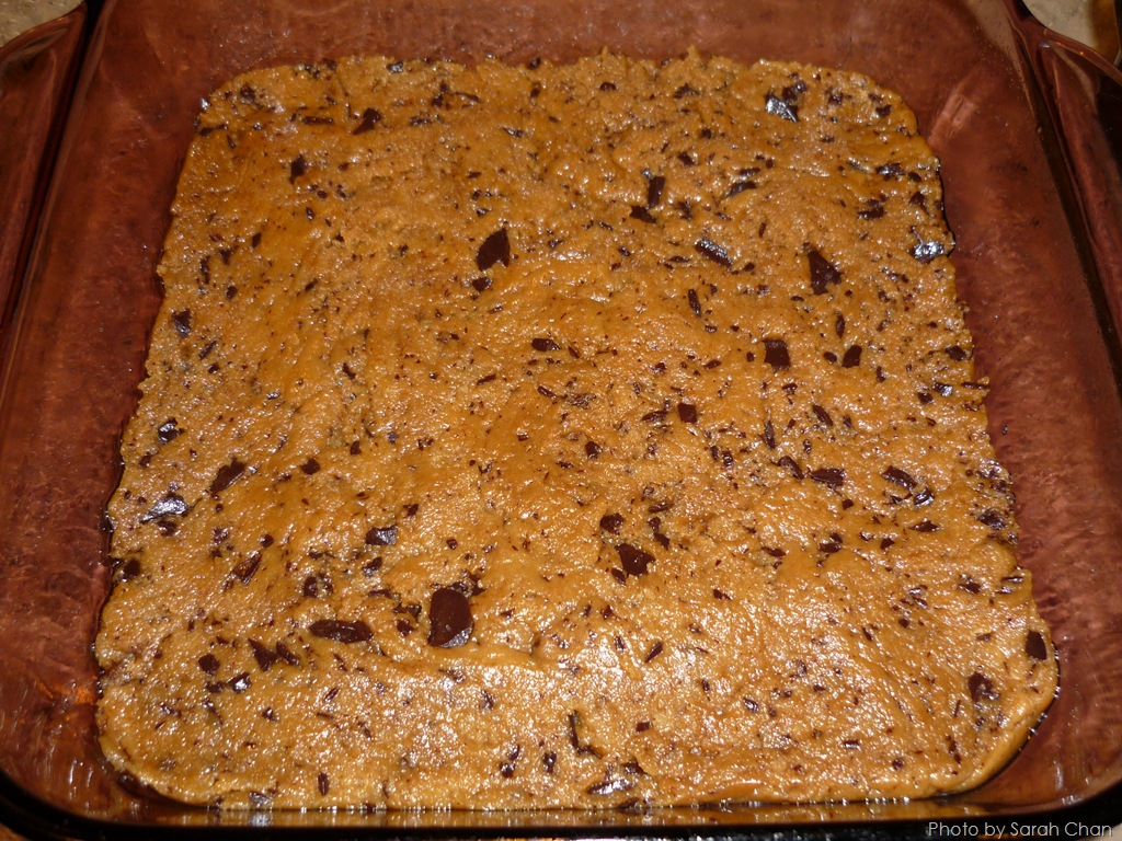 - Stir in the flour mixture and the nuts (in this case, the chocolate instead of walnuts) until well blended. Spread evenly in prepared pan. Bake 25-30 minutes or until surface springs back when gently pressed. Cool slightly. While still warm, cut into bars with a sharp knife.