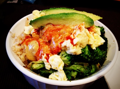 On top of the rice was some egg whites, sautéed broccoli, avocado, Yumm! sauce, and Tapatio.