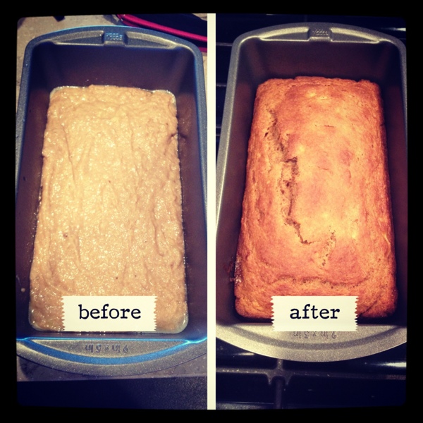 Last night, I found myself with a couple of really black bananas. Of course I just had to find another recipe for good ol’ banana bread since I had no blueberries this time. Upon researching many different sites, I came upon Julie’s Healthy Banana Bread recipe.
