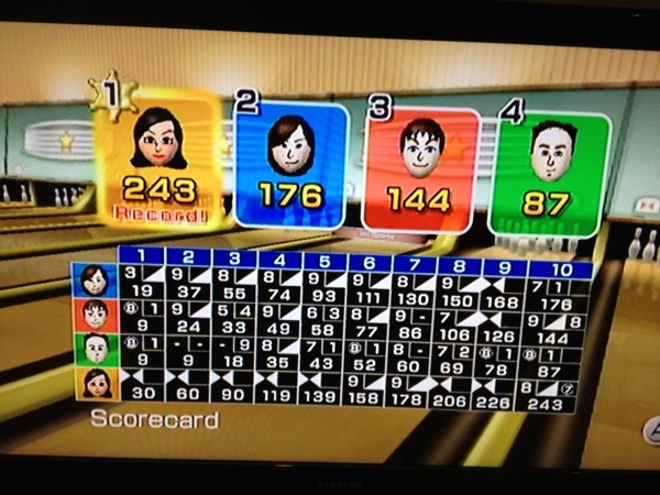 Instead, we hung out at the house getting started with an early morning rousing game of Wii bowling. When we play this, it always involves rules for strikes, errors, etc. and beer. There was one last game where I managed to bowl seven strikes!! I just had to take a picture of this for memory purposes and my barely-breaking-100 self will probably make a reappearance next time.