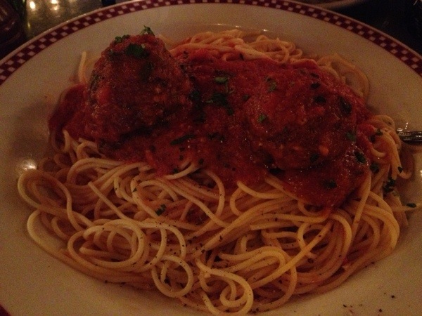 For dinner, we started with some fried calamari and bread with olive oil. Both were delish. My entree, which I had in May, was the spaghetti topped with two giant Painted Hills meatballs. My appetite just wasn’t there… it never seems to be the night before a race, but I tried to eat as much as I could. Everything was delish.