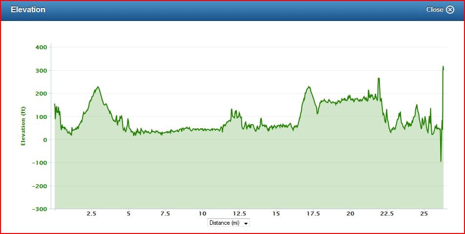 The elevation of the course was crazy at mile 17. That was what killed me. At about mile 2.5 there was also a large elevation increase. Total elevation gain: 1,525 ft. Total elevation loss: 1,325 ft.