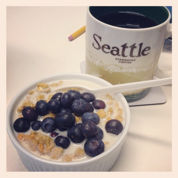 Oh, before I forget! I am making a note here that I’d like to bring more of my lunches to work. Breakfasts are always homemade and brought to work. Today I had a new cereal (I usually don’t do cereal; more of an oatmeal or egg sandwich gal) — Kashi Go Lean Crisp, topped with unsweetened almond milk and blueberries. So delicious.