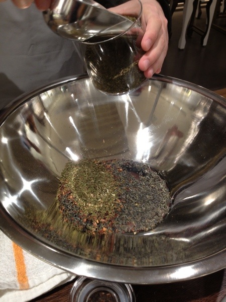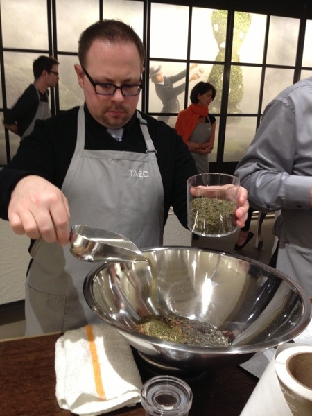 Once you’ve decided on the teas you’d like to blend up, the Tazo expert blends away in a giant metal bowl. Watch at home go!