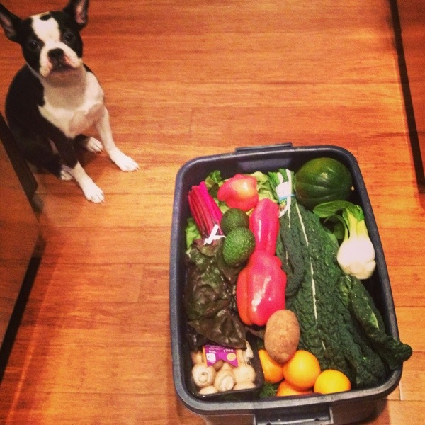 The bin included items such as Lacinato Kale (dinosaur kale), red bell peppers, onions, crimini mushrooms, baby bok choy, potatoes, red chard, Braeburn apples, minneola tangelos, avocados, green leaf lettuce, etc. Amazing.