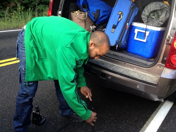 Stranded on the side of the road with no cell reception, we attempted to drop down the spare tire from underneath the vehicle. This involved emptying all our trunk space in the rain, taking out the tools, only to find out the spare tire was locked! There was no way to drop down the spare tire with the tools we had. A few people stopped to try to help but they couldn’t help either stating that the rental car company locked our tire to prevent tire theft. A race official stopped and tried to help and then had to radio back to command center. He came by and checked on us multiple times, thankfully.