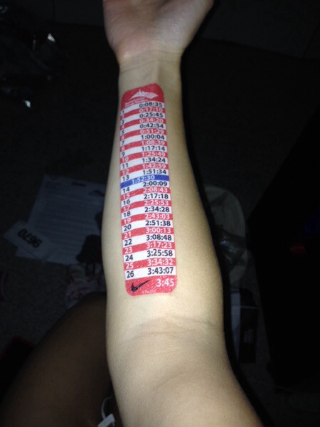 For anyone interested, here’s my 3:45 pace tattoo. Loved this and really recommend using a pace tattoo or band. Since the satellite signal for my Garmin watch was way off for most of the first part of the race, I leveraged the total elapsed accumulated time and compared against the target total time by mile in order to keep on pace.