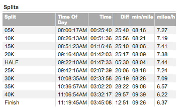 I was on such a roll. I had never felt so good during a race before. At some point after the half marathon mark, I surpassed the 3:40 marathon pace group and it set in that I could potentially achieve a 3:3x marathon. I kept it up pretty well and went at my pace with every 5K clocking in around 25 minutes. Each mile that I hit, I was excited to be increasing the deficit to my 3:45 target. 3 minutes under goal, 4 minutes under goal, and so forth. I was stoked.